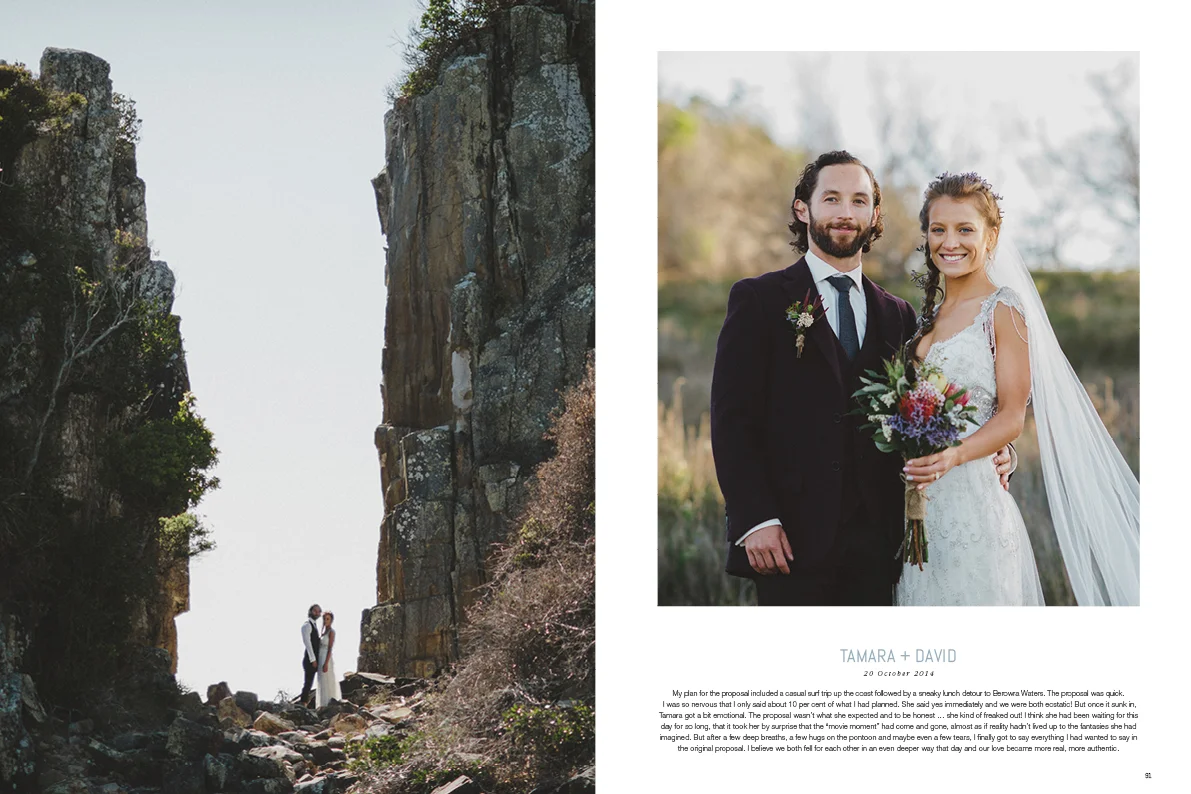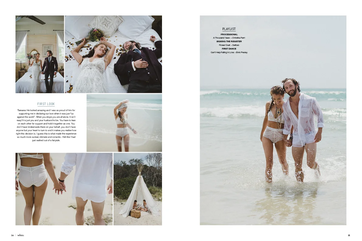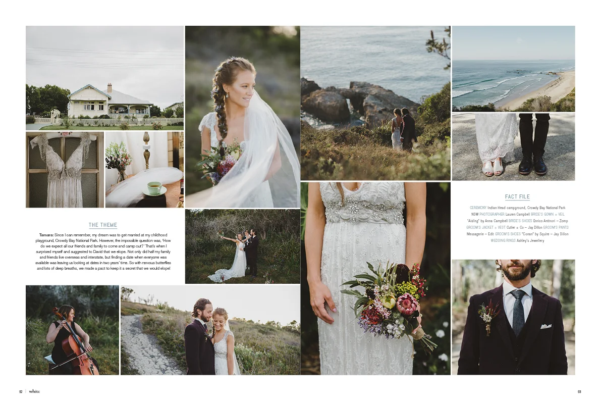 My beautiful couple Tamara & David eloped in the Crowdy Bay National Park at the end of last year. It was such an intimate wedding. Sunrise, on-top of a cliff over looking the ocean, and just the three of us exploring the beaches and forest surrounds all day. Pure magic! I am thrilled to share some of the details from their day that are currently featured inside issue 28 of White! If you haven't gone out and bought this issue I really recommend it. It's filled with so much love and inspiration.